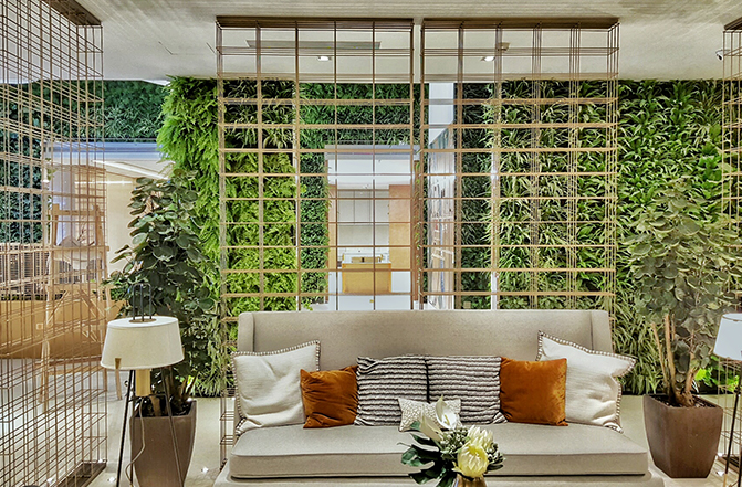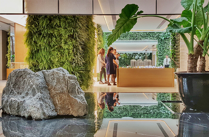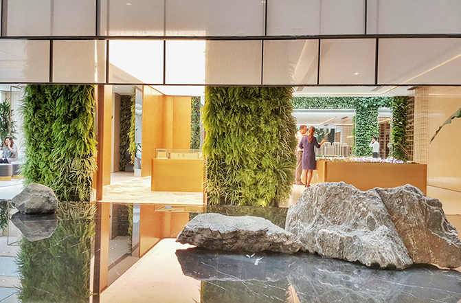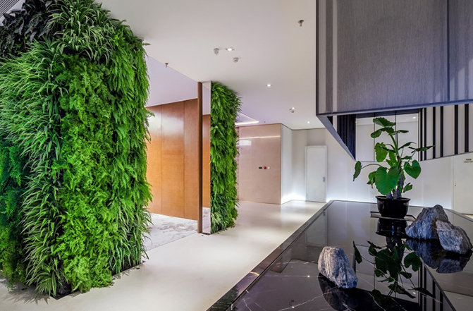 在高大的玻璃幕墻一側(cè),選用黑白灰有質(zhì)感的花器栽植極具自然生命張力的蕨類和骨子里散發(fā)著東方氣息的蘭花,以及春羽、棕竹、鶴望蘭等大型闊葉植物構(gòu)成了靜謐的東方花園。