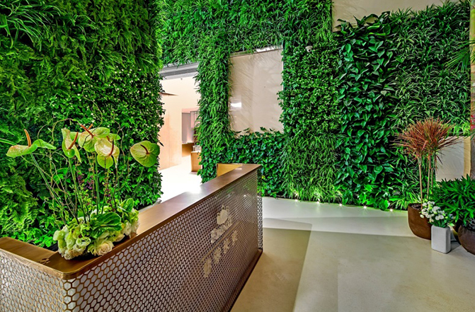 入口處兩組高大的植物撐起了室外內(nèi)的過渡空間,極其高挑的熱帶棕櫚植物,搭配深褐色粗陶盆器,輔以綠墻為背景,感覺就如同進(jìn)入了植物園一般,營(yíng)造了強(qiáng)烈的儀式感。