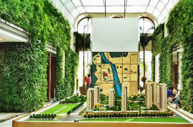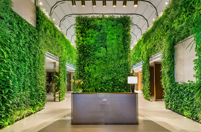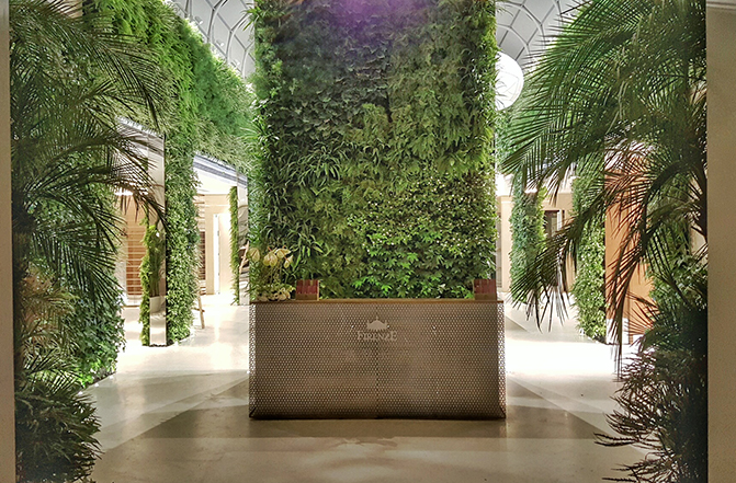 這塊區(qū)域有著大型的玻璃拱頂,入口處一面2.8m*5.2m的景墻,兩邊的植物墻高度近6m,進(jìn)深20余米,圍合起令人震撼的綠色花園。對(duì)于6.5m高的空間,其體量是極大的,很可能因高度的圍合造成壓抑感。因此,我們采用了抽象派風(fēng)格的至上主義理念,用最簡(jiǎn)單的幾何形體,穿插組合,沿著人的視線往遠(yuǎn)處延伸,構(gòu)成植物墻基本的框架。使整個(gè)空間橫向拓展,緩解壓抑感。