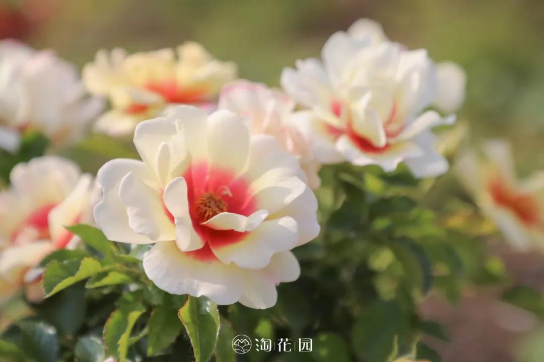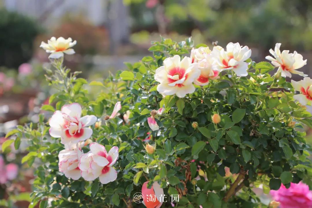 輝煌巴比倫眼睛屬于雜交波斯薔薇,花瓣邊緣由白色向淺黃色過渡,狀如其名,中心有暗紅色花斑,像一只炯炯有神的大眼睛。株型緊湊且分枝性高,花朵簇生開放,持續開花性好,也非常適合用于棒棒糖月季。