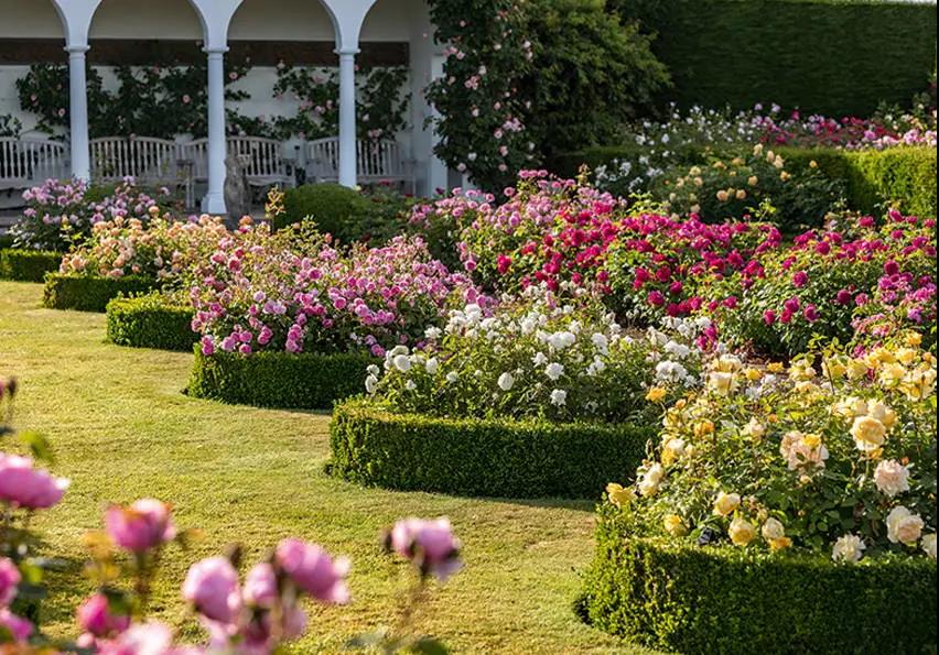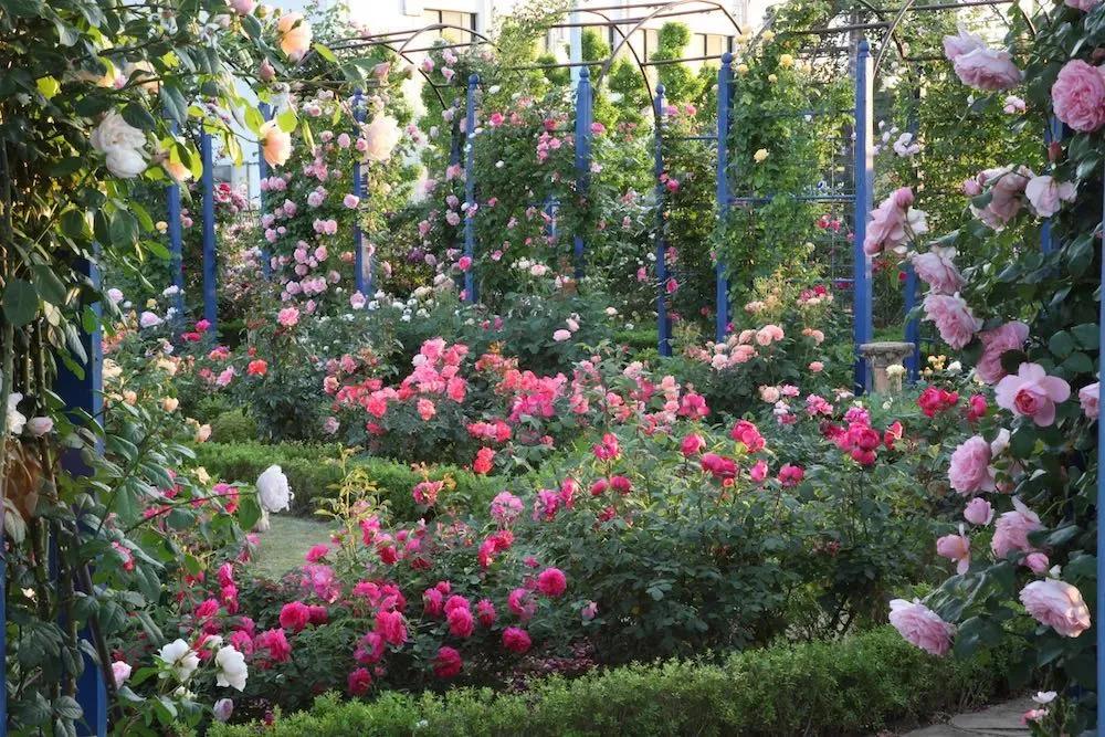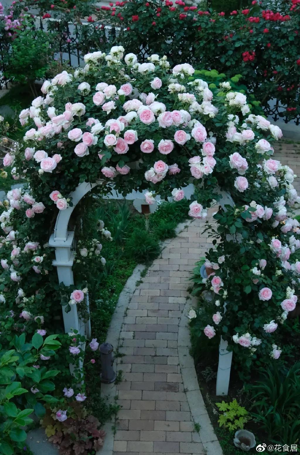 月季拱門的打造,推薦選擇花量大、枝條柔軟好牽引、不會過分伸展的藤本類品種,經過適當地打理,會呈現出非常好的拱門效果。